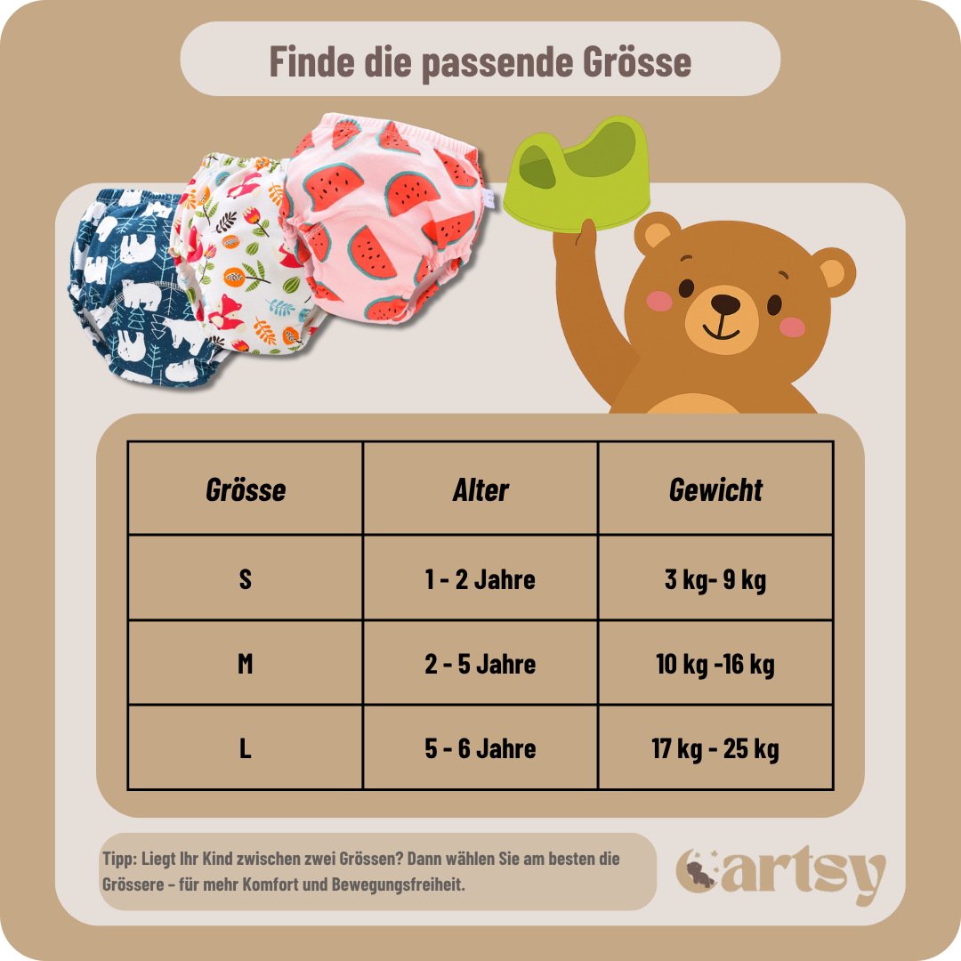 Schon nach wenigen Wochen ist dein Kind erfahrungsgemäss windelfrei – mit Sicherheit durch Cartsy Trainingswindeln!